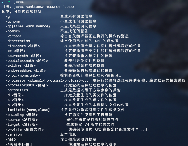 验证JDK是否安装成功可以在终端输入javac,如果出现如下信息就配置成功了。