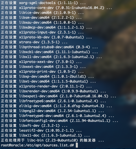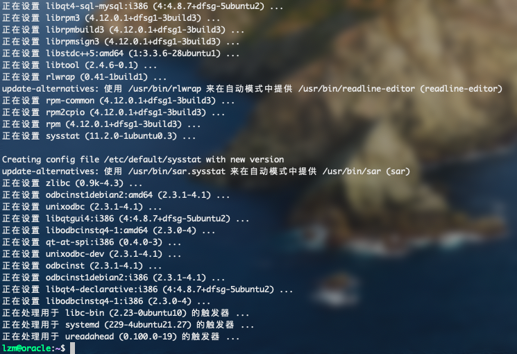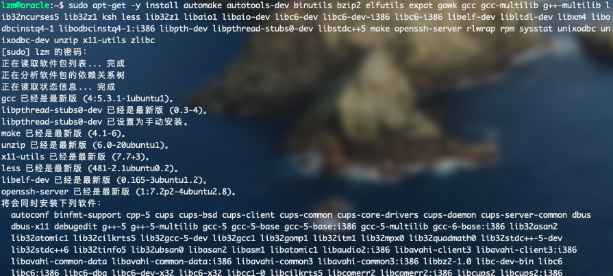 sudo apt-get -y install automake autotools-dev binutils bzip2 elfutils expat gawk gcc gcc-multilib g++-multilib lib32ncurses5 lib32z1 ksh less lib32z1 libaio1 libaio-dev libc6-dev libc6-dev-i386 libc6-i386 libelf-dev libltdl-dev libxm4 libodbcinstq4-1 libodbcinstq4-1:i386 libpth-dev libpthread-stubs0-dev libstdc++5 make openssh-server rlwrap rpm sysstat unixodbc unixodbc-dev unzip x11-utils zlibc